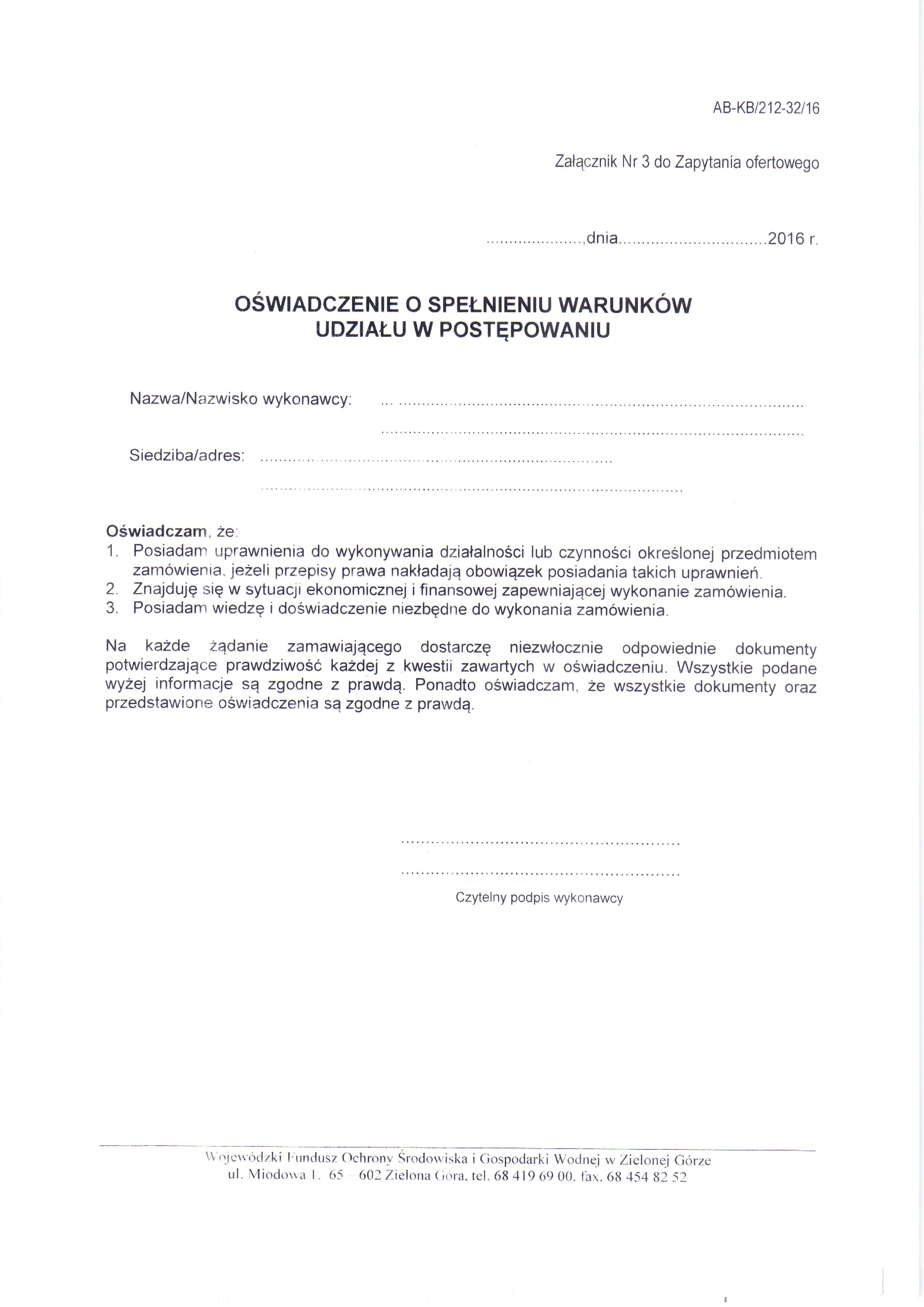 - Ofertę należy złożyć w kopercie listownie lub przesłać w formie faxu pod nr 68 454 82 52, e-mailem na adres sekretariat@wfosigw.zgora.pl, do siedziby Wojewódzkiego Funduszu Ochrony Środowiska i Gospodarki Wodnej w Zielonej Górze, ul. Miodowa 11, 65 – 602 Zielona Góra, sektrtariat II piętro, w terminie do godziny 15,00 w dniu 28 grudnia 2016 r.
