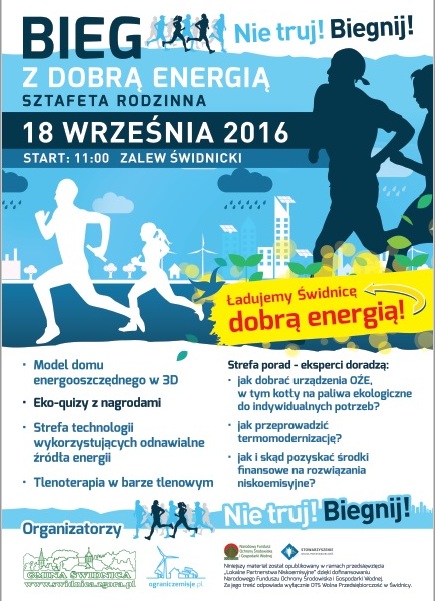 Osoby, chcące wyrazić swoje wsparcie dla wspomnianej idei na początek wezmą udział w rodzinnym biegu sztafetowym, który odbędzie się pod hasłem "Nie truj! Biegnij!". Bieg odbędzie wokół zalewu. Na wszystkich uczestników czekają upominki oraz ekologiczny poczęstunek. Dodatkowo 3 najszybsze drużyny zostaną nagrodzone medalami i miernikami jakości powietrza, temperatury i wilgotności. Zapisy na bieg prowadzone są w Urzędzie Gminy Świdnica (Świdnica, ul. Długa 38; tel. 68 327-31-15 wew. 144) lub pod adresem mailowym m.kostrzewa@swidnica.zgora.pl